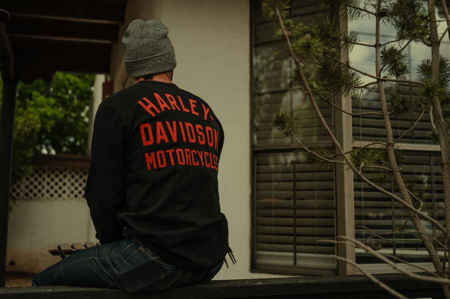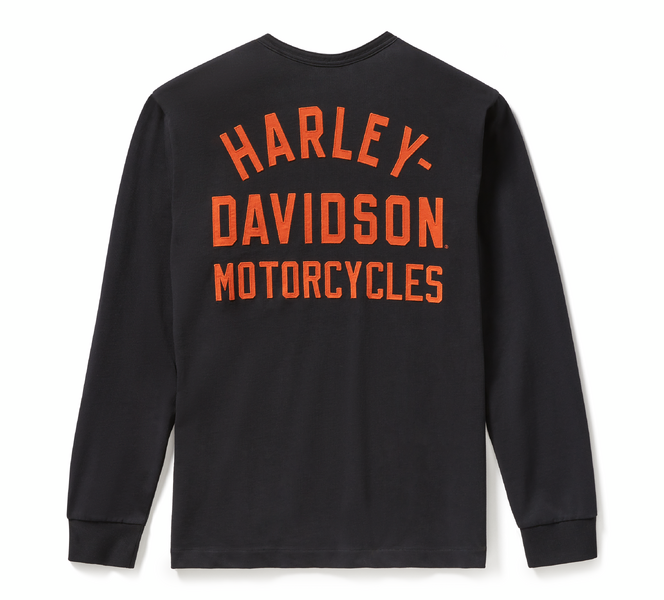 This favorite casual silhouette honors our flat track heritage. Made from heavyweight cotton jersey, our Racer Font Henley is washed for softness and a well-worn look. This men’s long sleeve Henley features a three-button placket plus rib-knit cuffs to help keep its shape. It’s finished with an embroidered hit of our Bar & Shield on front and a stitched appliqué on back that resembles racing team jerseys in our archives.
